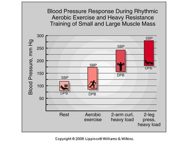 As one can see, blood pressure increases when going from “rest” to “exercise”. Generally, blood pressure increases more, the more intense the exercise is. Generally, blood pressure increases to a greater extent, especially diastolic blood pressure, with resistance training compared to aerobic training. While, blood pressure increases with all exercise, it is for a short period of time (out of your 24-hour day). In the graph below, occasionally, the blood pressure was close to 300/150 (really high!) during this series of weight lifting repetitions, but only momentarily, and returns to “normal” in between sets.